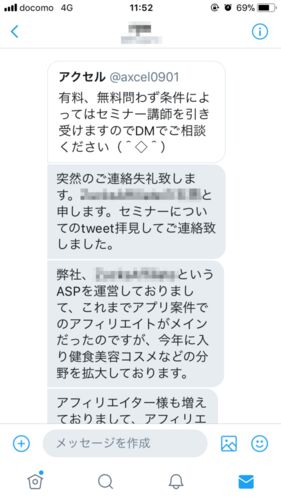 どうもアクセルです。 最近は、DMでセミナー講師依頼をされることが多く充実した日々を送っています。 ツイッターでセミナー講師依頼をうけつけていたら、こんなDMが届きました。 最近はサプリで何ジャンルも攻めていたので、2つ返事でお引き受けしました。…